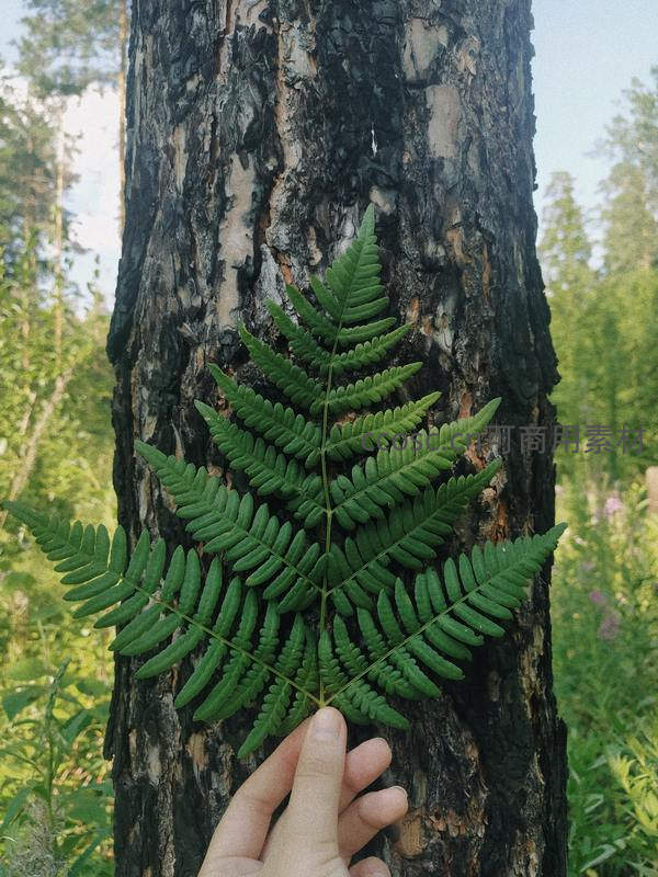 一只手轻托着一片翠绿的蕨类叶片,背景是粗糙的深色树干和模糊的林间绿意,展现人与自然的亲密接触。