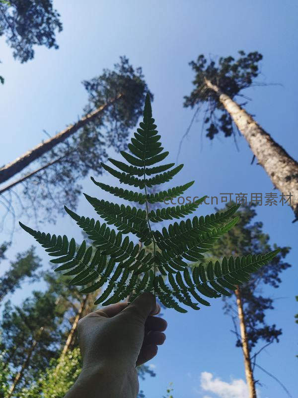 在晴朗的蓝天下,一只手高举蕨叶,背景是挺拔入云的松树,营造出开阔、自由的森林氛围。
