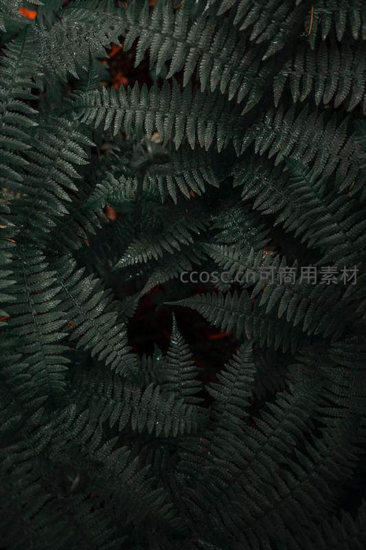 在幽暗的环境中,蕨叶层层交叠,微弱的光线穿透缝隙,在叶片上投下斑驳光影,透出一丝秋日气息。