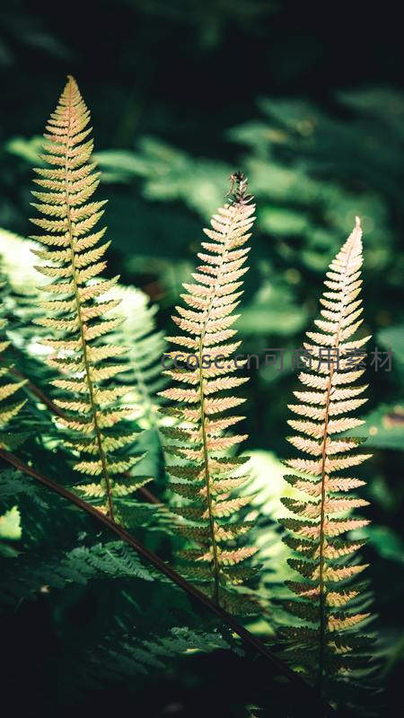 三片蕨叶在柔和的逆光下显得通透,边缘泛着金色光芒,背景虚化,整体画面温柔而富有诗意。