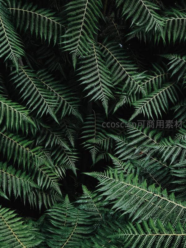 多片深绿色蕨叶层层叠叠,在幽暗背景下形成富有韵律感的抽象视觉图案,充满原始森林的神秘与静谧。