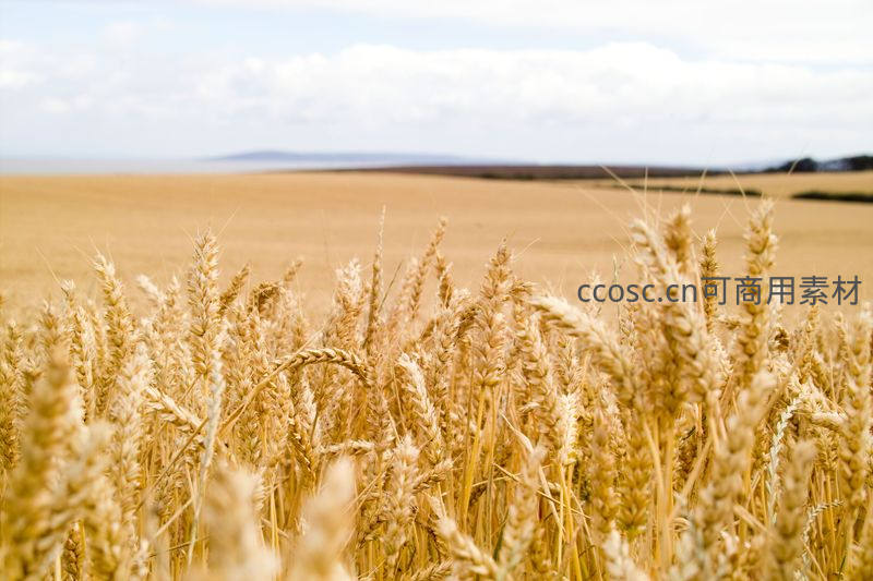 成熟的麦田在微风中起伏如浪,前景的麦穗清晰可见,远景是连绵的山丘和蓝天白云,构图层次分明,展现了大自然赋予土地的慷慨与壮美。