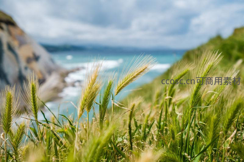 前景是随风摇曳的金色麦穗,背景是波涛汹涌的蓝色大海和陡峭的悬崖,构成一幅壮丽的滨海自然画卷,令人心旷神怡。