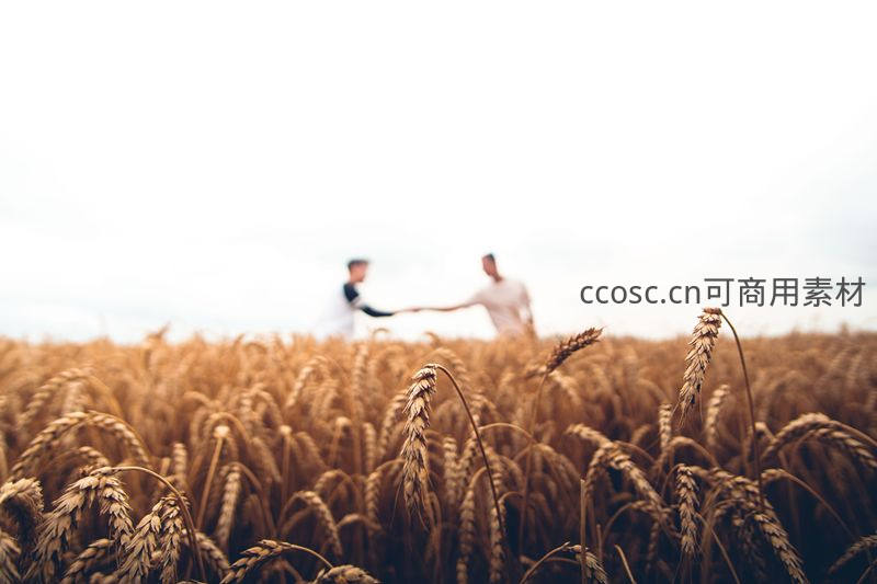 一对恋人在成熟的麦田中牵手漫步,前景的麦穗清晰可见,背景中的人影朦胧,营造出浪漫唯美的氛围。