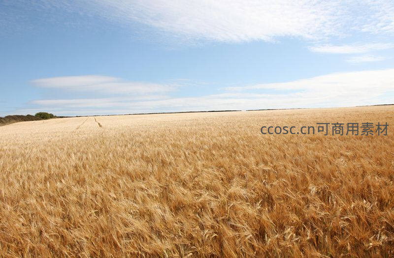 从高空俯瞰一望无际的成熟麦田,蓝天白云映衬下,大地如金色海洋般壮阔宁静。