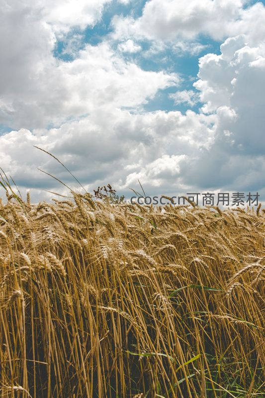 广阔的金色麦田在蔚蓝天空与朵朵白云的映衬下显得格外壮丽,风吹麦浪起伏,展现了大自然的恢弘与农业的丰饶景象。