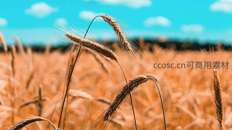 湛蓝的天空下,几株饱满的麦穗在风中优雅地弯腰,与远处的云朵和无垠的麦田构成一幅宁静而充满生命力的田园画卷。
