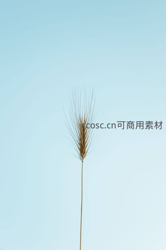 一株成熟的麦穗在纯净的浅蓝色天空背景下亭亭玉立,其纤细的茎秆和饱满的穗头形成强烈的视觉对比,传递出一种宁静、坚韧与希望。