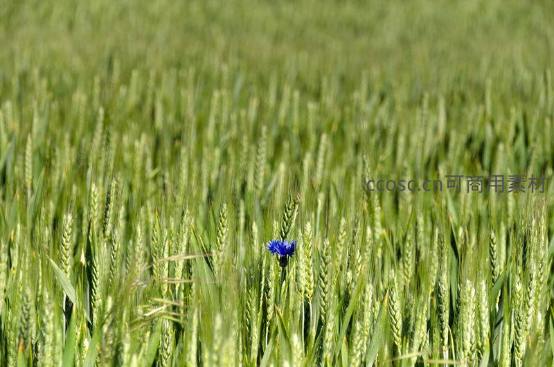 在一片翠绿的麦苗中,一朵娇艳的蓝色矢车菊悄然绽放,为宁静的田野增添了一抹灵动与诗意。
