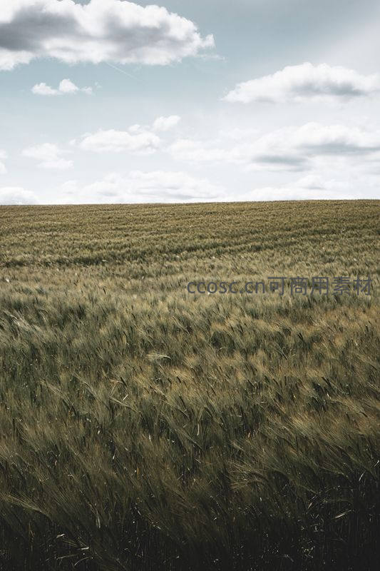 一片尚未成熟的青绿麦田,在晴朗的蓝天下随风摇曳,洁白的云朵点缀其间,构成一幅宁静而充满希望的田园画卷。