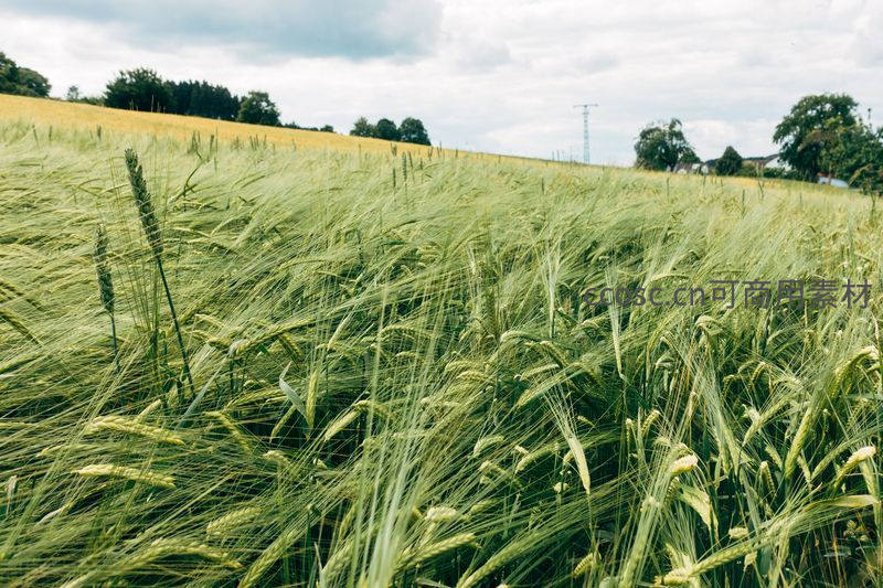 一片生机勃勃的绿色麦田,在柔和的微风中轻轻摇曳,远处是连绵的山丘和树木,展现了宁静而充满活力的田园风光。