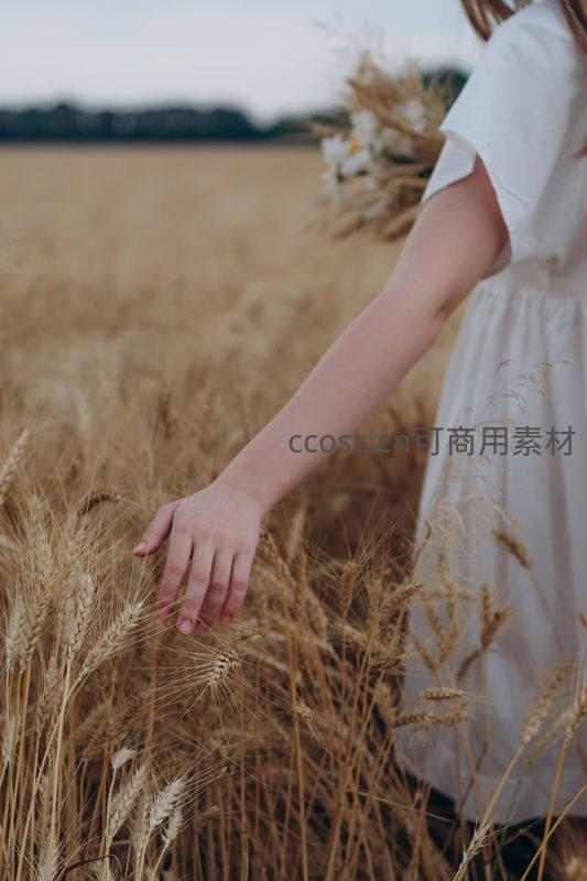 一位身着白衣的少女漫步在成熟的金色麦田中,温柔地抚摸着麦穗,背景朦胧,营造出宁静、浪漫且富有诗意的秋日氛围。