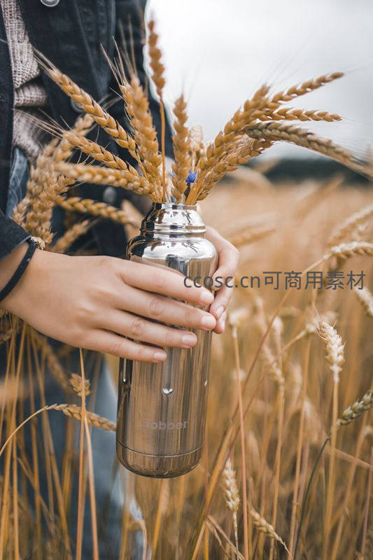 双手捧着插满金黄麦穗的银色保温杯,置身于无垠麦田中,捕捉人与自然和谐共处的惬意瞬间。