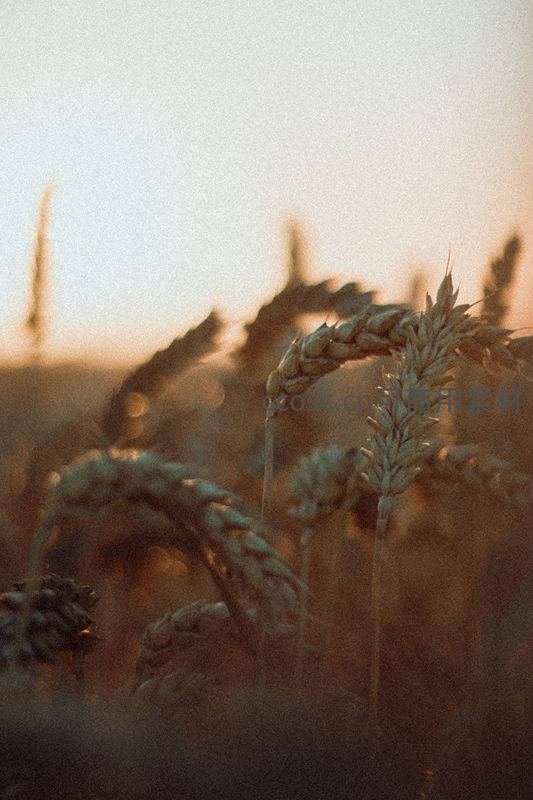 黄昏时分,麦穗在柔和光线下呈现朦胧剪影,画面带有胶片质感,充满诗意与怀旧气息,引人遐想。