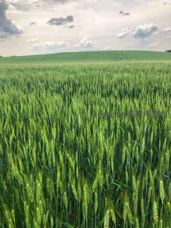 大片青翠欲滴的麦苗铺满起伏的绿色山丘,远处云层透出光束,预示着充满生机与希望的生长季节。