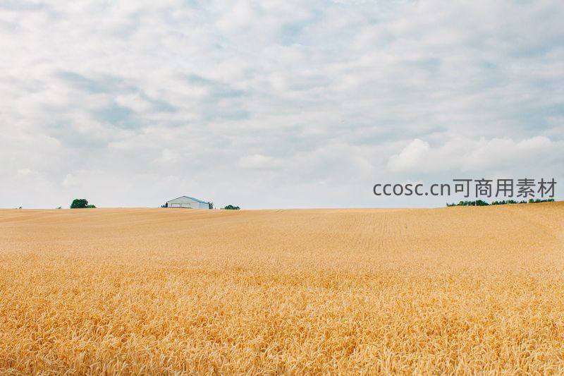 一片无垠的金色麦田在多云天空下延伸,远处一座孤零零的白色农舍静立其中,展现出宁静而辽阔的田园风光。