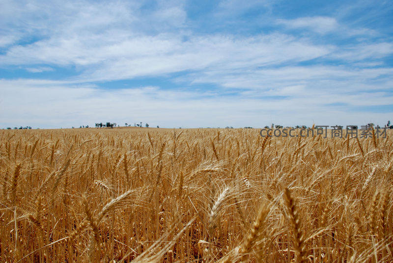 成熟的麦穗在蔚蓝天空和流云下随风摇曳,形成一片金色的海洋,充满了丰收的喜悦与自然的勃勃生机。