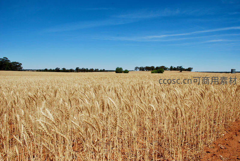 在清澈的蓝天之下,一望无际的金色麦田铺展到天边,前景是红色的土地小径,勾勒出一幅宁静而壮丽的农业画卷。