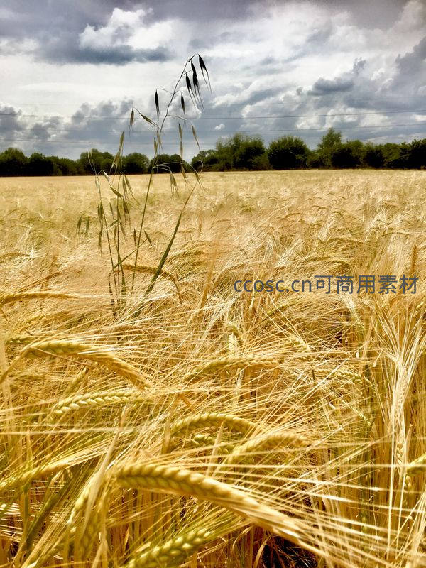厚重的乌云笼罩着金黄的麦田,前景的麦穗在风中剧烈摇摆,预示着一场风暴即将来临,画面充满戏剧性的自然张力。