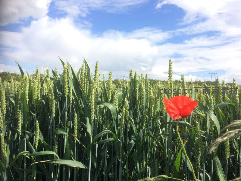 广袤绿色麦田中突现一朵鲜艳红罂粟,色彩对比强烈,为宁静田野注入一抹生动与诗意。
