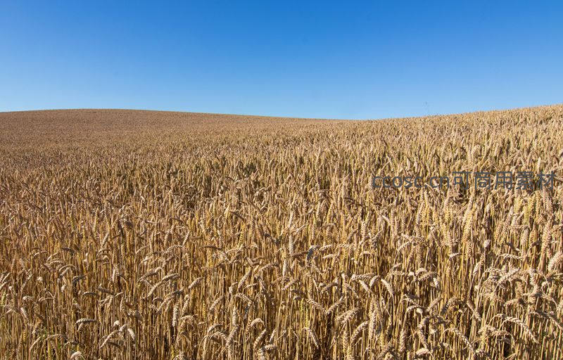 从高空俯瞰,连绵起伏的金色麦浪与纯净蓝天相接,展现大自然壮丽景观与农业丰收的磅礴气势。