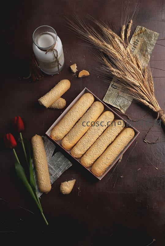 深色木桌上摆放着芝麻饼干、玻璃瓶牛奶、新鲜麦穗与红郁金香,构成温馨健康的早餐静物场景。