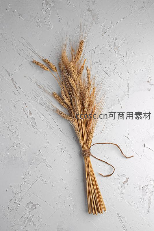 一束金黄麦穗用麻绳系好,斜靠在带有粗糙肌理的浅灰色墙面上,展现质朴自然的装饰美感。