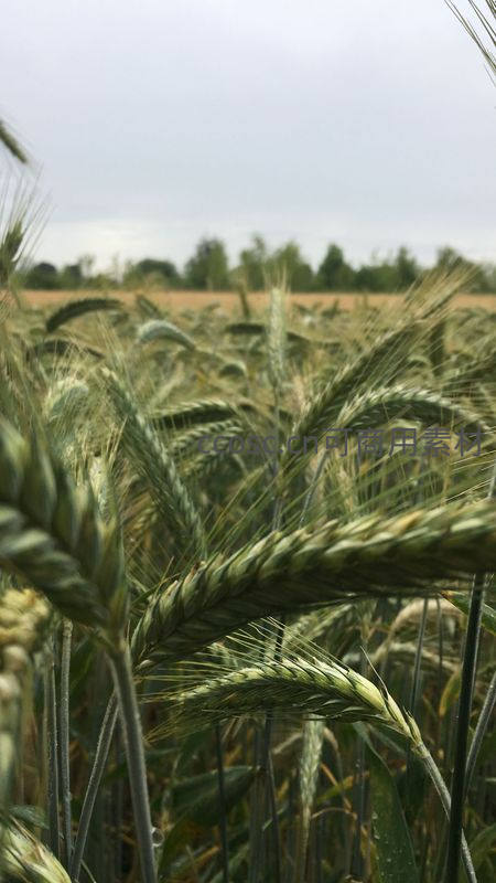 镜头聚焦于青翠欲滴的麦穗,背景是朦胧的田野与树林,展现了农作物蓬勃的生命力和宁静的田园风光。