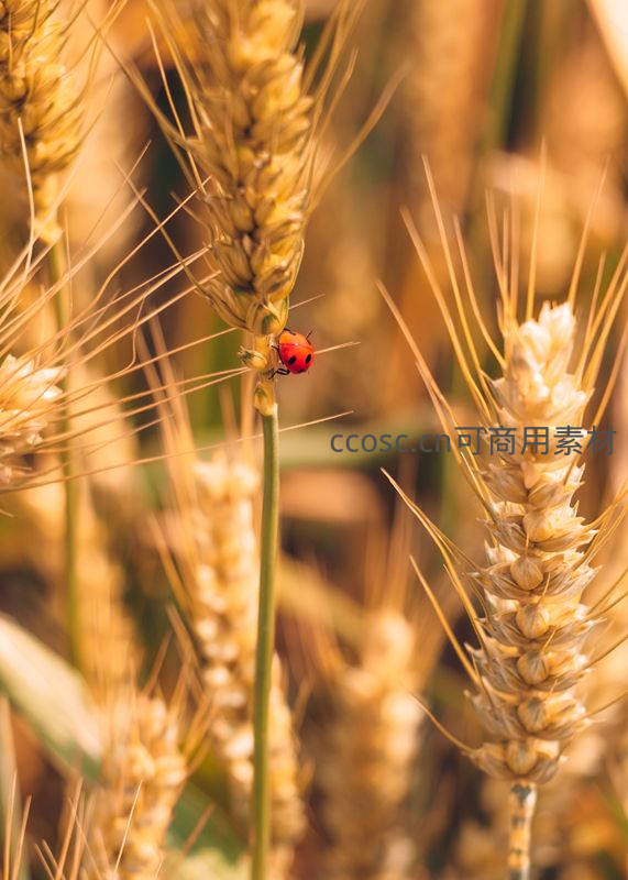 一只鲜红的瓢虫停驻在饱满的金色麦穗上,微距镜头捕捉了这一生动瞬间,展现了农田生态系统中微小生命的活力与和谐。