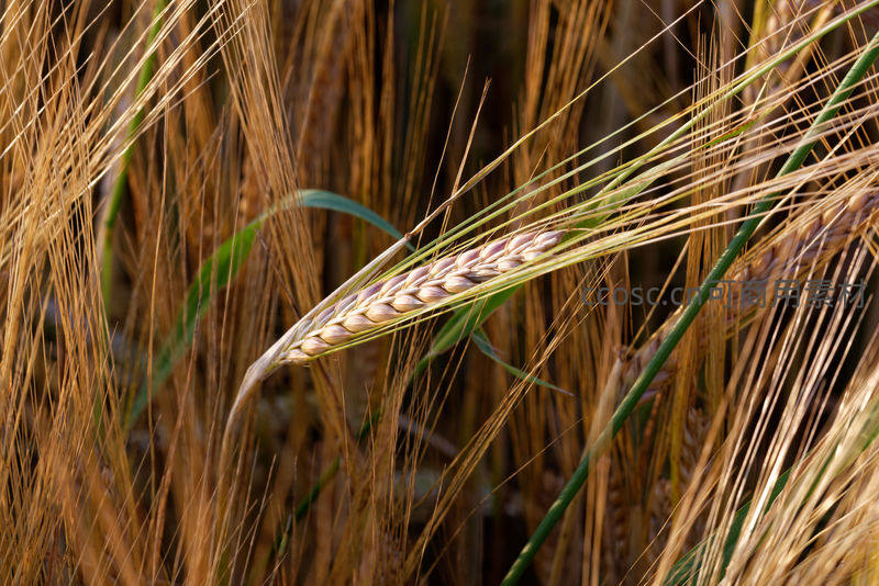 近距离捕捉一株麦穗,其饱满的籽粒和纤细的麦芒在绿叶映衬下格外突出,光线勾勒出每一粒的纹理,展现生命的精致与力量。