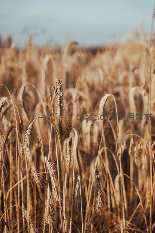 成熟的麦田在夕阳下泛着温暖的金光,沉甸甸的麦穗随风摇曳,构成一幅宁静而丰饶的田园风光图景。