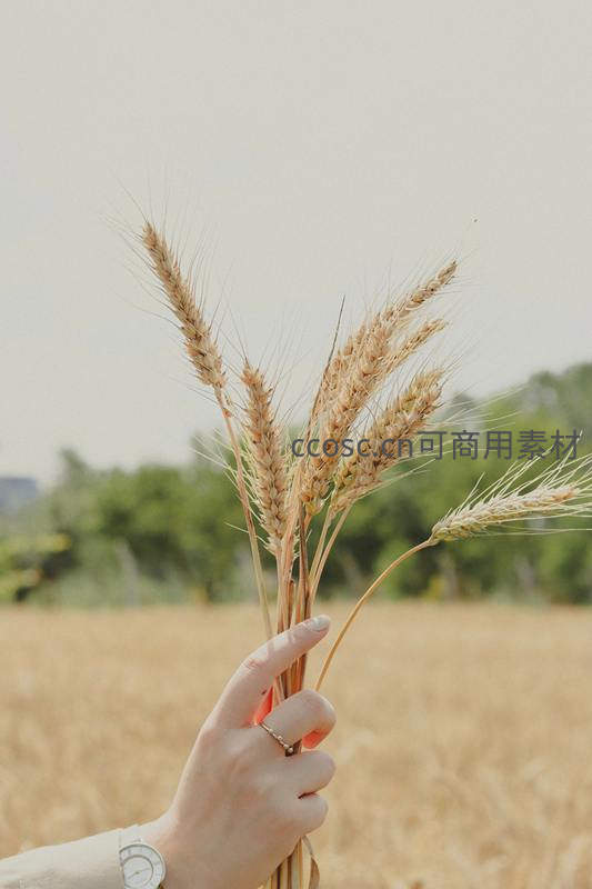 一只佩戴戒指和手表的手,稳稳地捧着一束刚收获的饱满麦穗,背景是朦胧的田野,象征着劳动的成果与对自然馈赠的珍视。