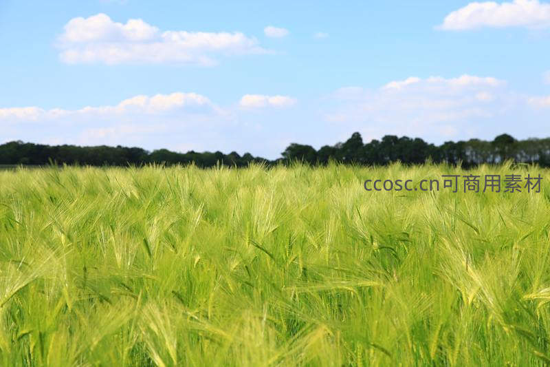 翠绿的青麦田在微风中轻轻摇曳,背景是纯净蓝天与朵朵白云,充满蓬勃生机,预示着即将到来的丰收季节。