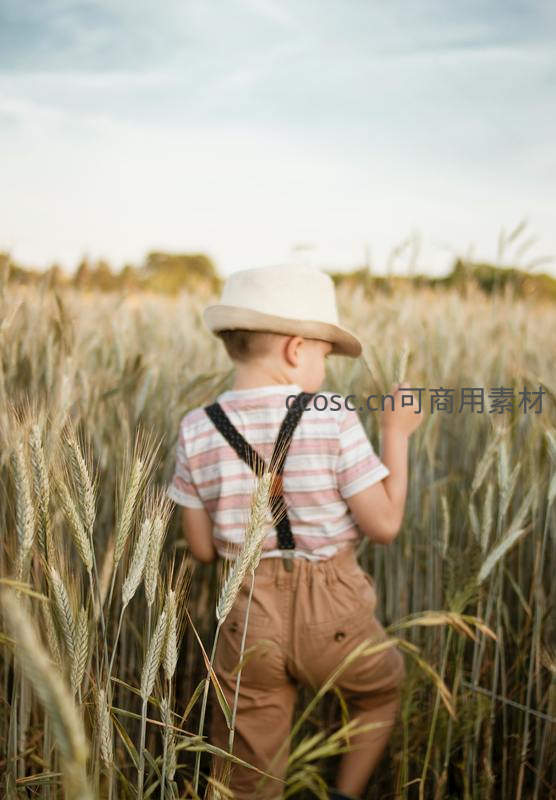 一个穿着条纹衫和吊带裤的小男孩背对镜头,头戴草帽,手抚麦穗,漫步在无垠的金色麦田里,象征着纯真与自然的童年探索之旅。
