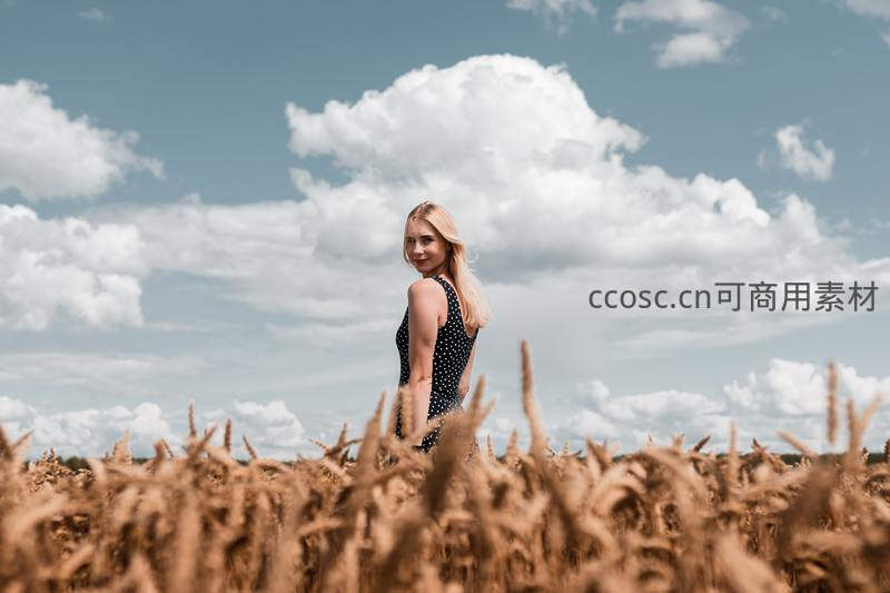 一位金发女子身着波点连衣裙,站在丰收的麦田中回眸微笑,背景是蓝天白云,画面充满宁静与诗意。