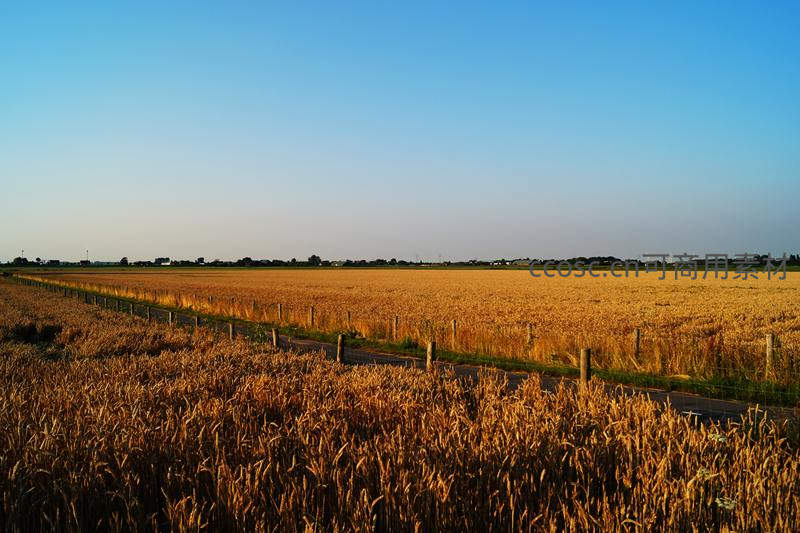 夕阳余晖洒满无垠的金色麦田,一条小路蜿蜒穿过,远处天际线清晰,展现宁静而壮丽的乡村丰收景象。