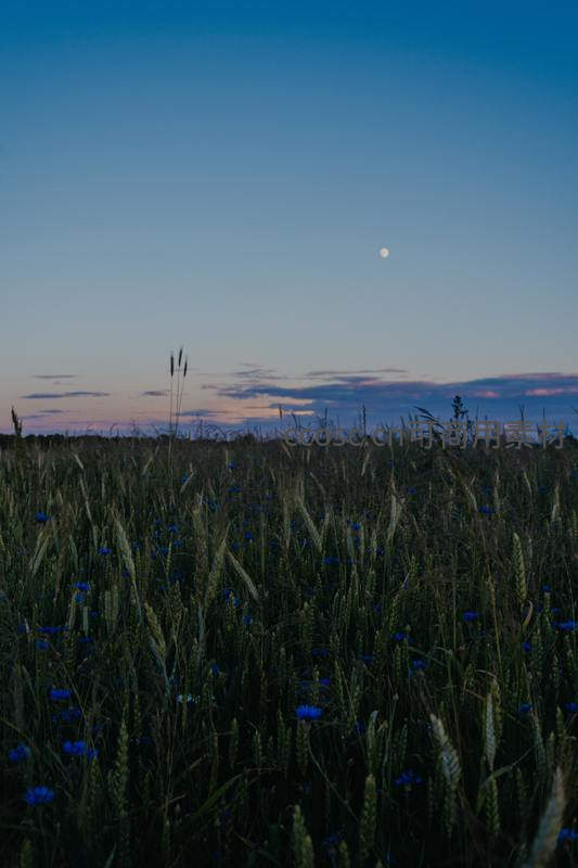 月夜麦田与蓝色小花