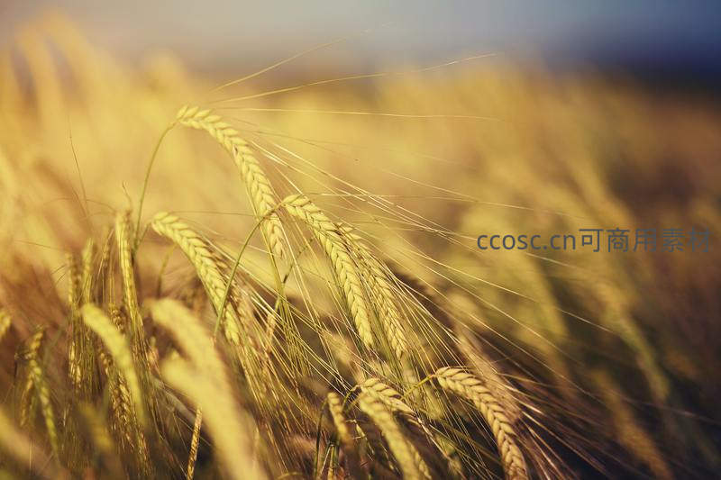 在温暖的夕阳余晖中,几株成熟的麦穗被特写镜头捕捉,饱满的颗粒和细长的芒刺在光线下清晰可见,充满了丰收的喜悦与自然的诗意。