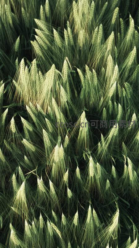 俯瞰视角下,青翠欲滴的麦穗紧密排列,阳光洒落其上,展现出旺盛的生命力与自然的宁静之美。