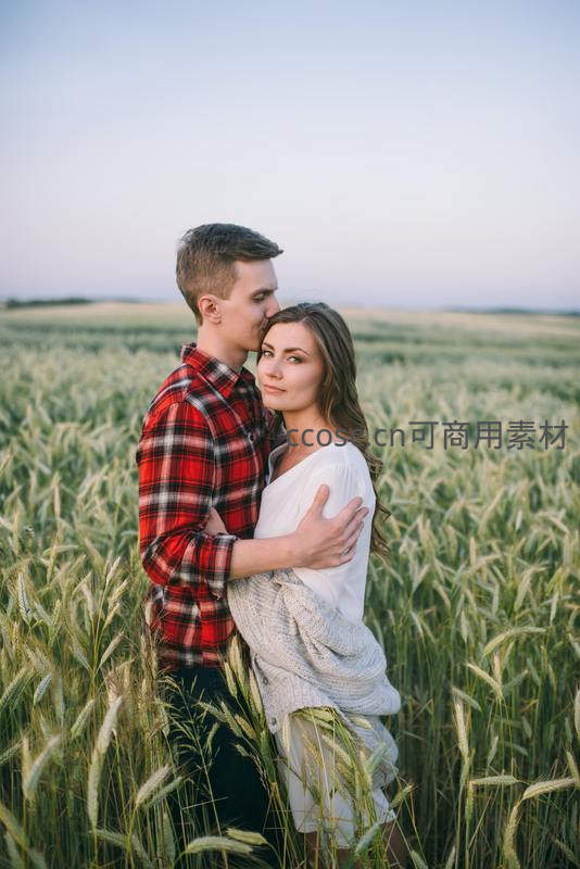 一对情侣在夕阳下的绿色麦田中深情相拥,男子轻吻女子额头,画面充满温馨、浪漫与对未来的美好憧憬。