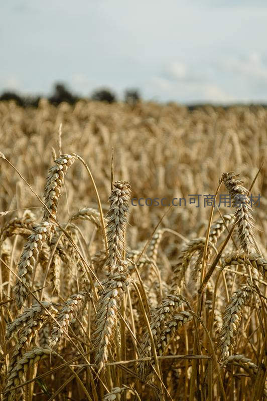 前景中几株饱满的麦穗在阳光下熠熠生辉,背景是模糊的广阔麦田和天空,突显了即将收割的丰饶与希望。