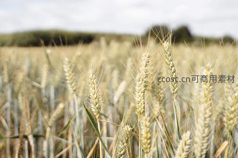 开阔的麦田延伸至远方,背景是模糊的树林与多云天空,营造出宁静辽阔的田园氛围,展现大地的壮美。