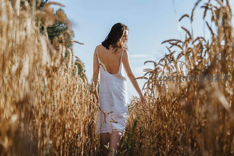 女子背影漫步麦田小径,阳光洒满全身