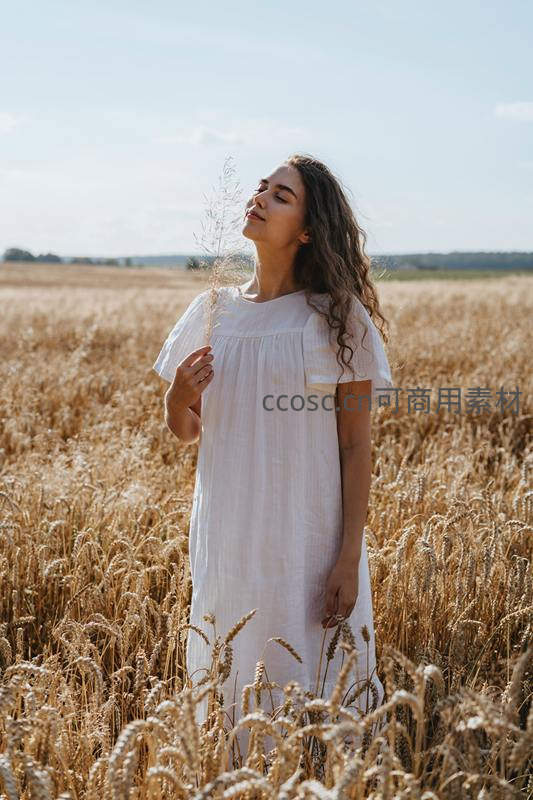 一位卷发少女身着宽松白裙,伫立在无垠的金色麦浪中,闭目仰头感受阳光洒落,手中轻握一束麦穗,神情安详而陶醉。
