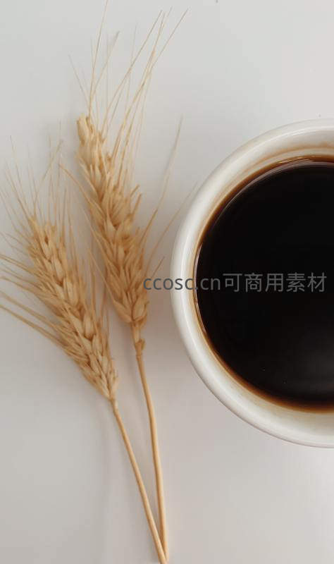 一杯深色咖啡置于纯白背景之上,旁边斜放着两支干燥的金黄麦穗,简约构图形成色彩与质感对比,传递出宁静惬意的生活美学。