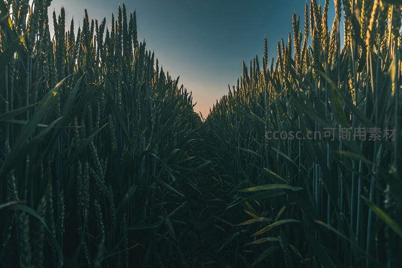 暮色中青翠麦田小径延伸向远方