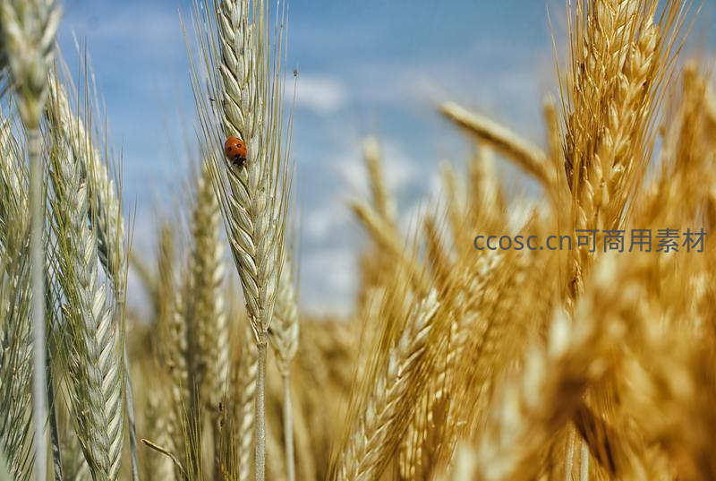 一只红色瓢虫静静停留在青黄相间的麦穗上,为广阔的金色麦田增添了一抹灵动的生命色彩,体现自然和谐。