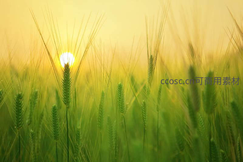 夕阳西下,金色阳光穿透青翠的麦田,形成梦幻般的逆光效果,象征着希望与新生,温暖而富有诗意。