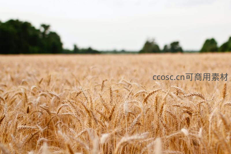 广袤的金色麦田在微风中起伏如浪,远处绿树与天空构成宁静背景。成熟的麦穗低垂,预示着丰收季节的到来,画面充满田园诗意与满足感。