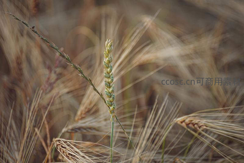 一株挺立的成熟麦穗在虚化的金色背景中格外醒目,细节清晰可见。它象征着在广阔田野中的坚韧与独立,微风轻拂,尽显自然造物的精致与力量。